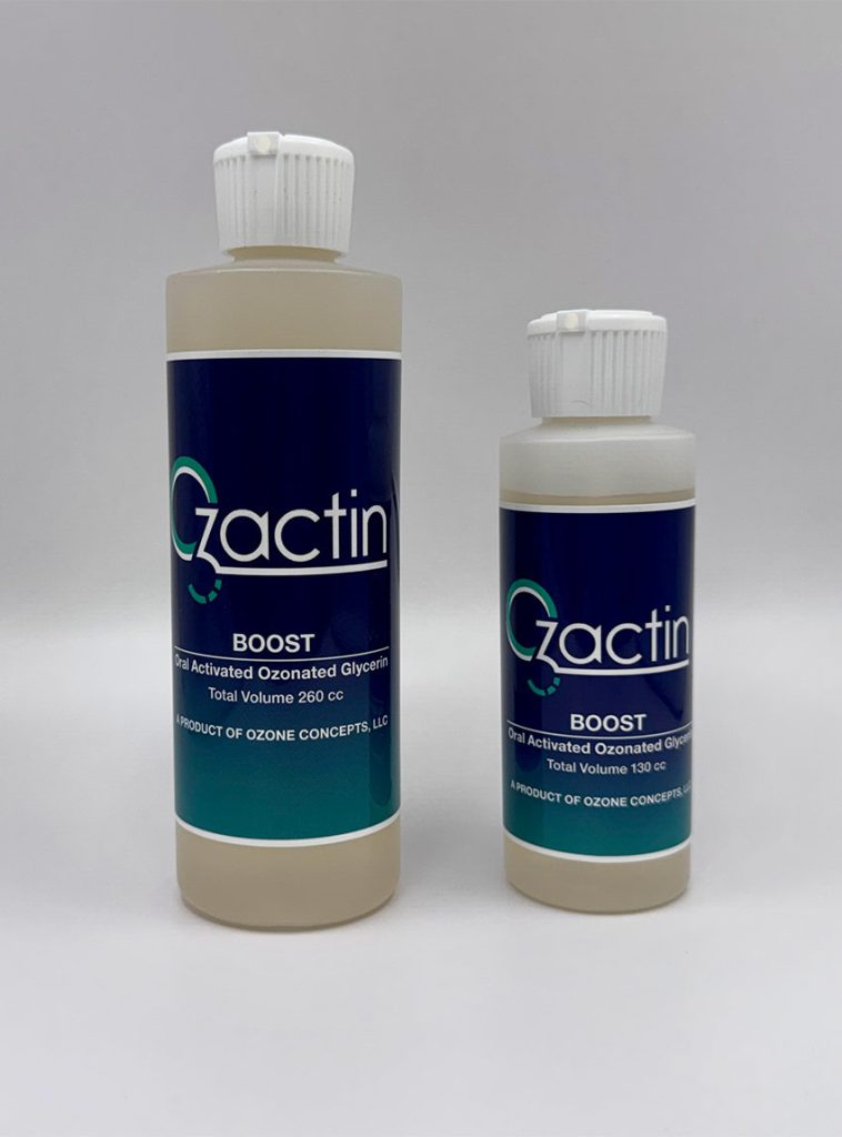Ozactin Boost makes it very easy to administer our Ozonated Glycerin. By adding it to Meta Rx or GastroFlow the effects of each will be enhanced as the two products work synergistically. This also provides a simple, effective, well accepted, mode of administration. Combining the two products will increase the days’ supply and the therapeutic action should be more than doubled than when using these products individually.